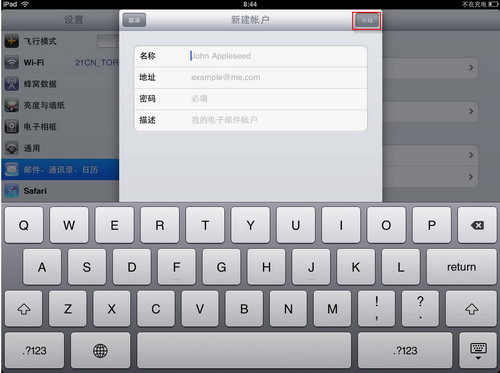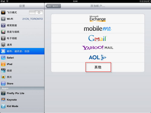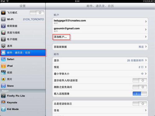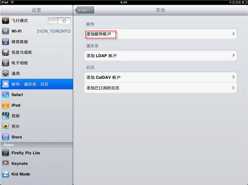 2、 進入IPad設置頁,點擊左邊的“郵件、通訊錄、日曆”菜單,右邊出現郵件、通訊錄、日曆的詳細配置頁,點擊“添加帳戶”;